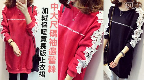 搶購好康中大尺碼袖邊蕾絲加絨保暖寬長版上衣裙-商品